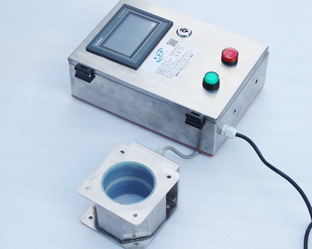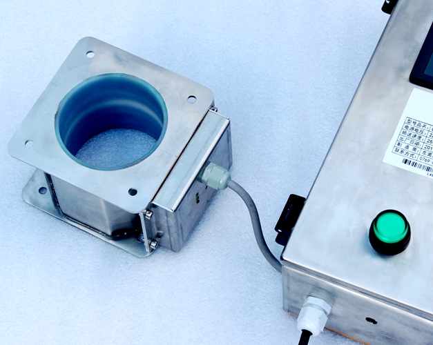 原料從料斗或送料器自由下落進(jìn)入金屬分離器,如果沒(méi)有金屬雜質(zhì),原料會(huì)直接通過(guò)金屬分離器流向下端的出料口。如果檢測(cè)器檢測(cè)到原料中含有金屬,那么控制器立刻啟動(dòng)分離板將金屬物和部分原料一起導(dǎo)向側(cè)面的排料口,然后分流板迅速恢復(fù)至正常的位置,分流板速度可調(diào),金屬分離器的檢測(cè)精度也可根據(jù)生產(chǎn)需要調(diào)節(jié),最小可檢測(cè)并分離出Φ 0.2mm的金屬顆粒。